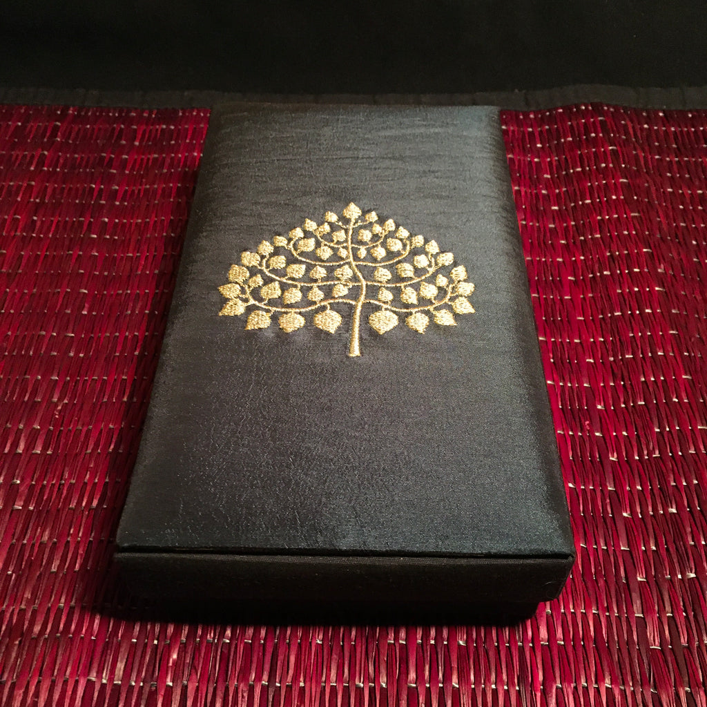 This Neroli Diffuser and Candle gift set is presented in a lovely Thai silk box with gold Tree of Life embroidery.  The set includes a Neroli fragrance bottle, soda wood diffuser and white plumeria flower candle.
